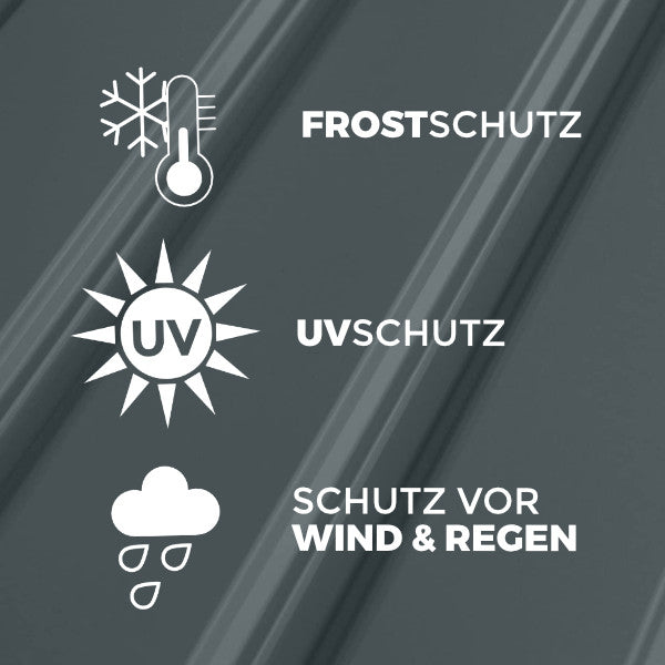 Das vollverzinkte Stahlblech sorgt für eine hohe Stabilität und Widerstandsfähigkeit bei Sonne, Regen, Wind und Schnee.